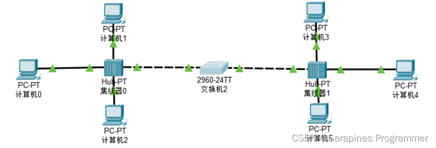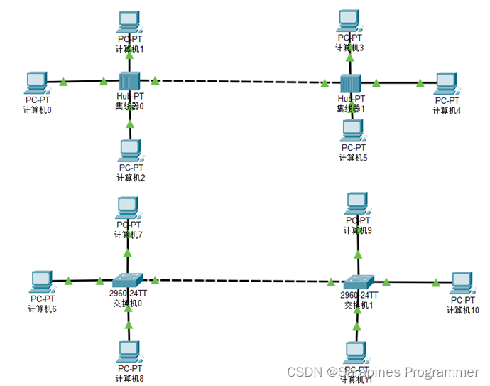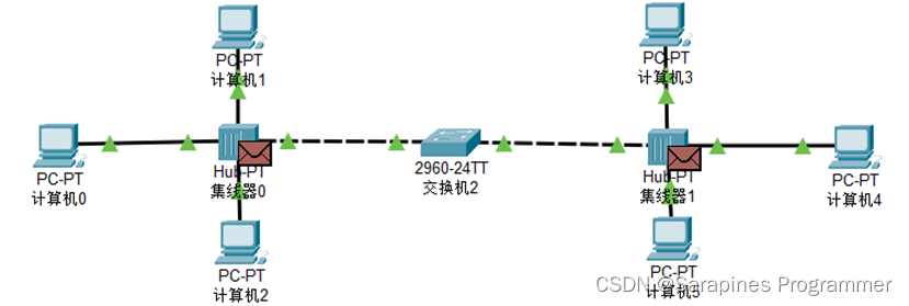 (6)step6 互联局域网:通过选择自动连线互联两个通过集线器互联的局域网,在扩大通信范围同时扩大碰撞率,同理连接两个交换机互联的局域网,遇到互联线不显示绿色可通过多次切换实时模式和仿真模式进行解决,最终效果: