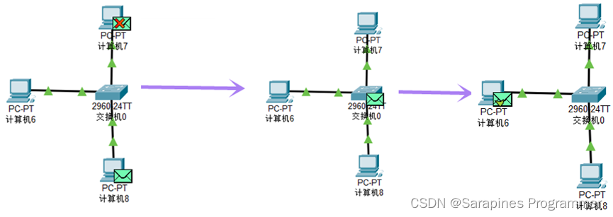 (5)step5 主机通过交换机进行数据传输:通过主机6与主机8间发送数据包实现,在左上角工具栏鼠标点击信封(添加简单的PDU),交换机的数据传输: