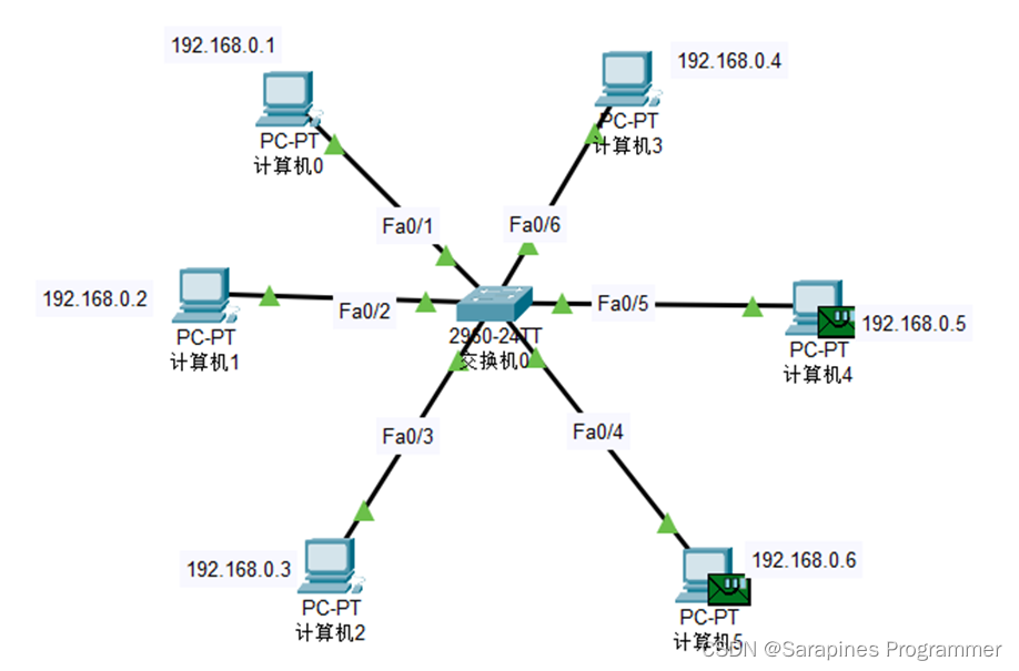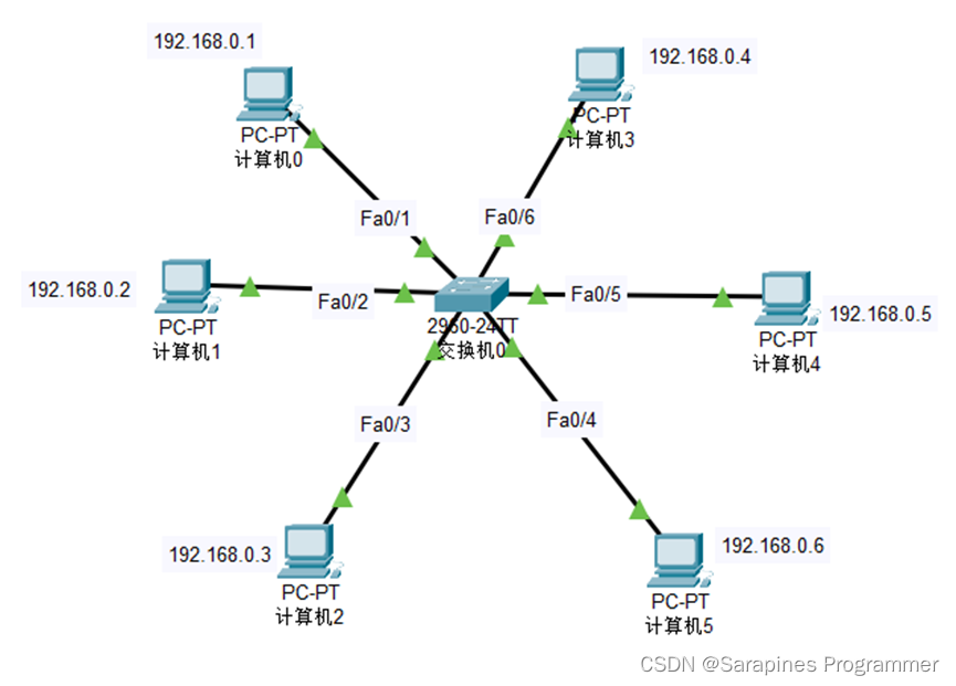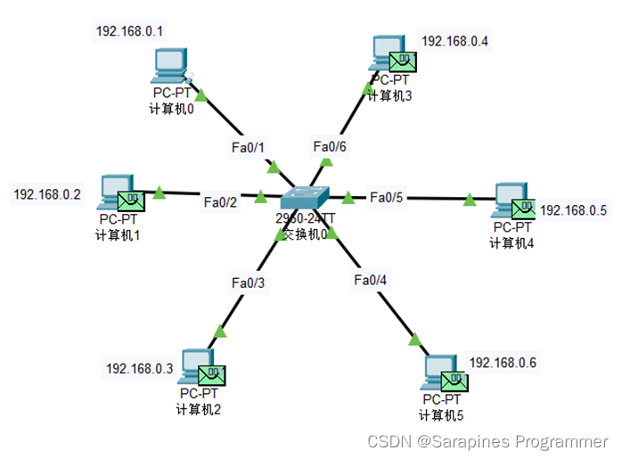 (1)step1 构造网络拓扑:在逻辑工作空间选择六台终端设备(此处拖动的为主机)、网络设备(此处拖动的为交换机)及连接线(此处拖动的为自动选择连接线类型),构造网络拓扑: