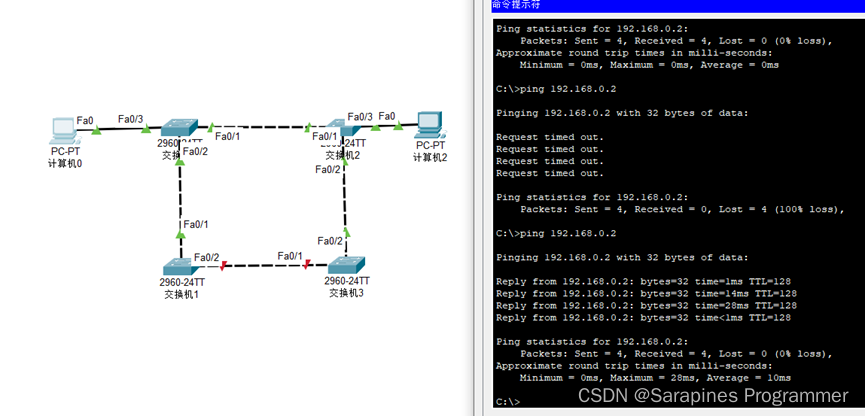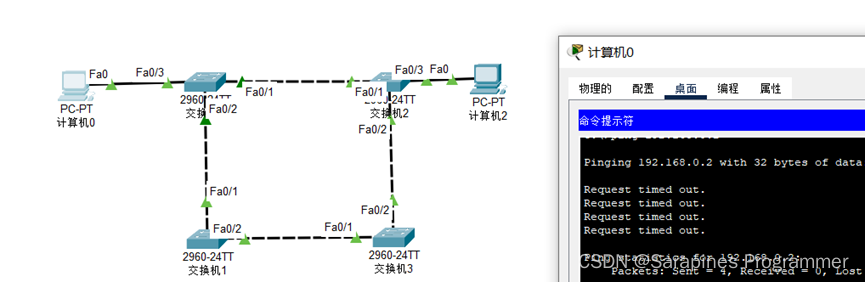 尝试在主机0的命令提示符键入ping 192.168.0.2,主机1向主机0发送也会如此,原因在于数据包在循环链路传输始终占用资源造成资源浪费。