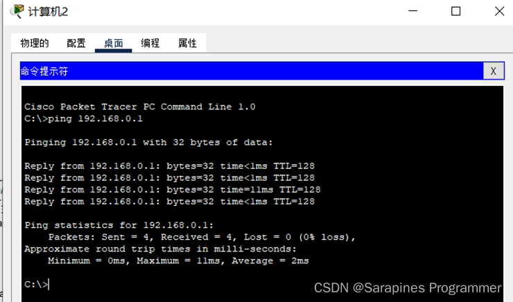 (3)step3 验证主机间能否进行通信:打开主机0的命令提示符输入ping 192.168.0.2,得到主机1的响应,主机0验证通信: