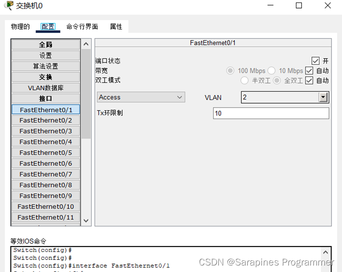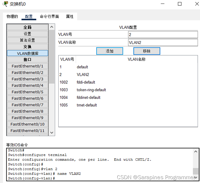 (3)step3 划分不同VLAN的端口:在交换机配置的VLAN数据库添加VLAN2: