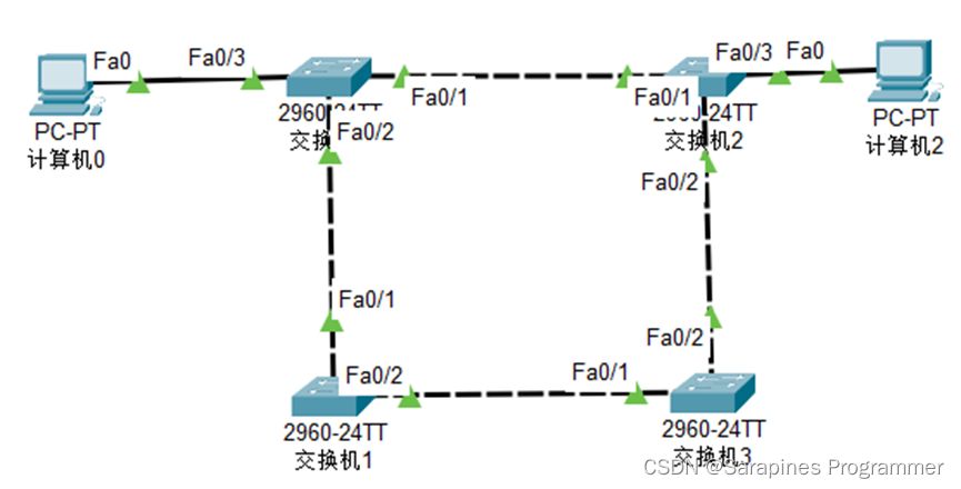 根据上述操作关闭四台交换机的生成树协议,可知四台交换机间的链路均显示为绿色,关闭交换机间的生成树协议: