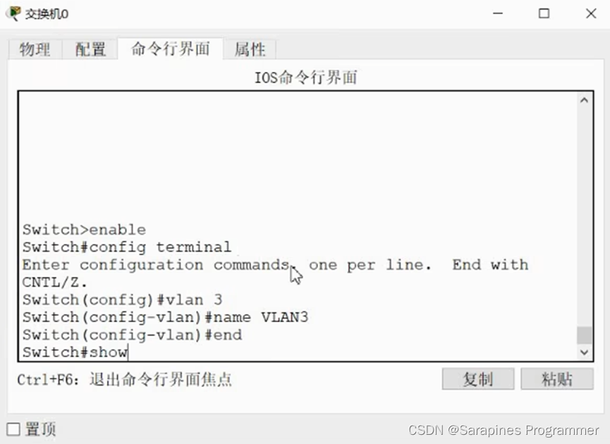 (5)5tep5 通过指令方式创建VLAN 3:由于配置交换机大多是在命令行配置,所以实验建立于命令行界面: