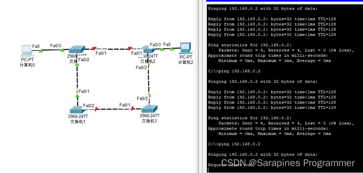 由于关闭交换机3的端口1,使得交换机2的端口得以打开(显示为绿色),再次在主机0的命令提示符键入ping 192.168.0.2,收到主机1的响应。