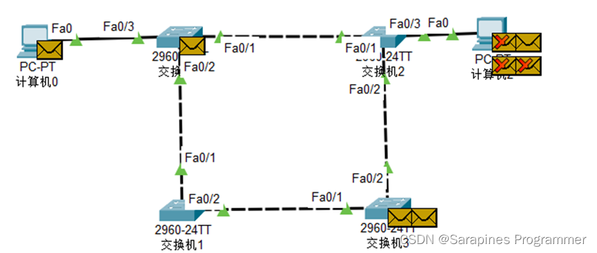在仿真模式下通过实验发现,数据包在环路里面一直在循环发送占用资源,数据包始终在环路循环: