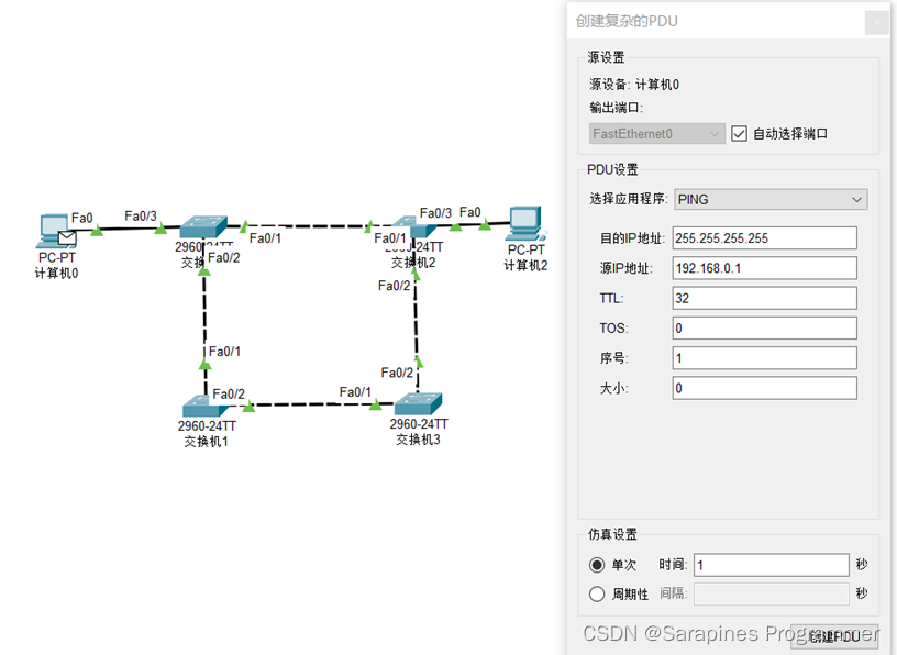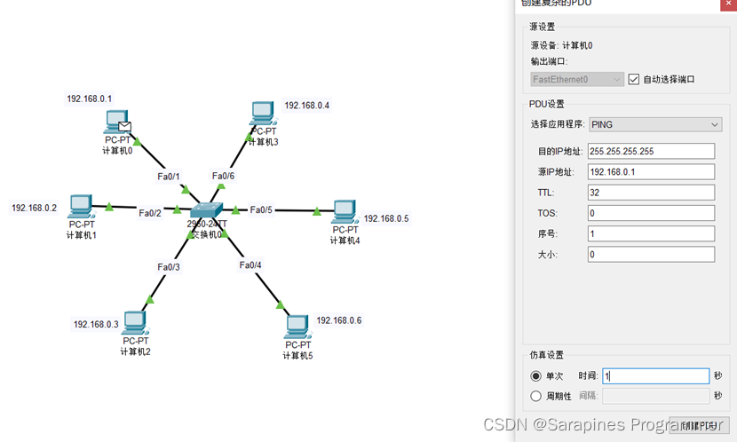(4)step4 验证不同VLAN的数据传输:由于配置的左边三台主机和右边三台主机的VLAN不同,所以VLAN1发出的广播仅在属于VLAN1的范围传输,VLAN2发出的广播仅在属于VLAN2的范围传输。通过创建复杂PDU在VLAN2中传输,数据包只传输给处在VLAN2范围内的主机而不传输给其他VLAN内的主机: