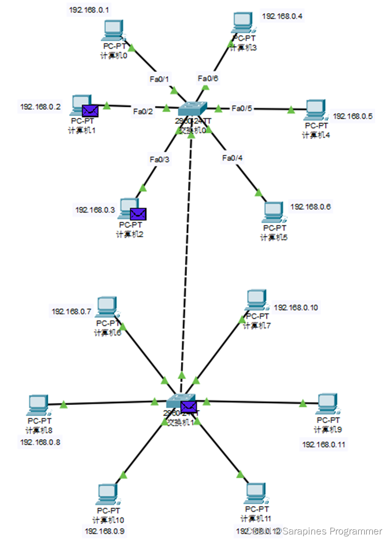 (6)step6 验证新的网络拓扑的数据传输:构造网络拓扑,设置新的IP地址以及设置左侧为VLAN1,右侧为VLAN 2,由主机0发送复杂的PDU: