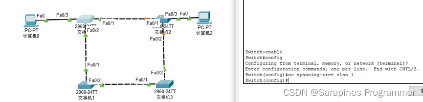 (5)step5 关闭交换机的生成树协议:通过点击交换机的命令行界面,输入enable加入课程模式,在输入config加入全局配置模式,使用no spanning-tree vlan 1关闭vlan 1下方的生成树协议。