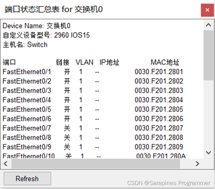 查看交换机的端口状态汇总表,仅有端口1至6开启且属于VLAN 1: