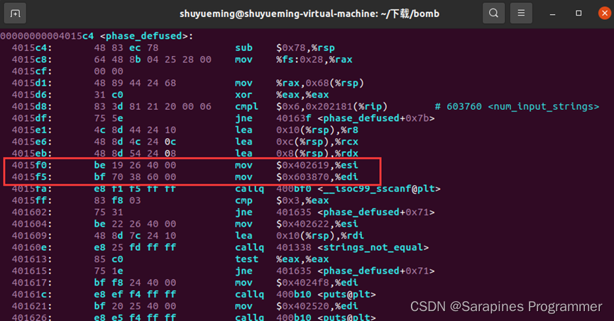 对phase_defused进行分析发现,在401604行出现了一个奇怪的地址为0x402622,在gdb输入print (char*)0x402622进行解析