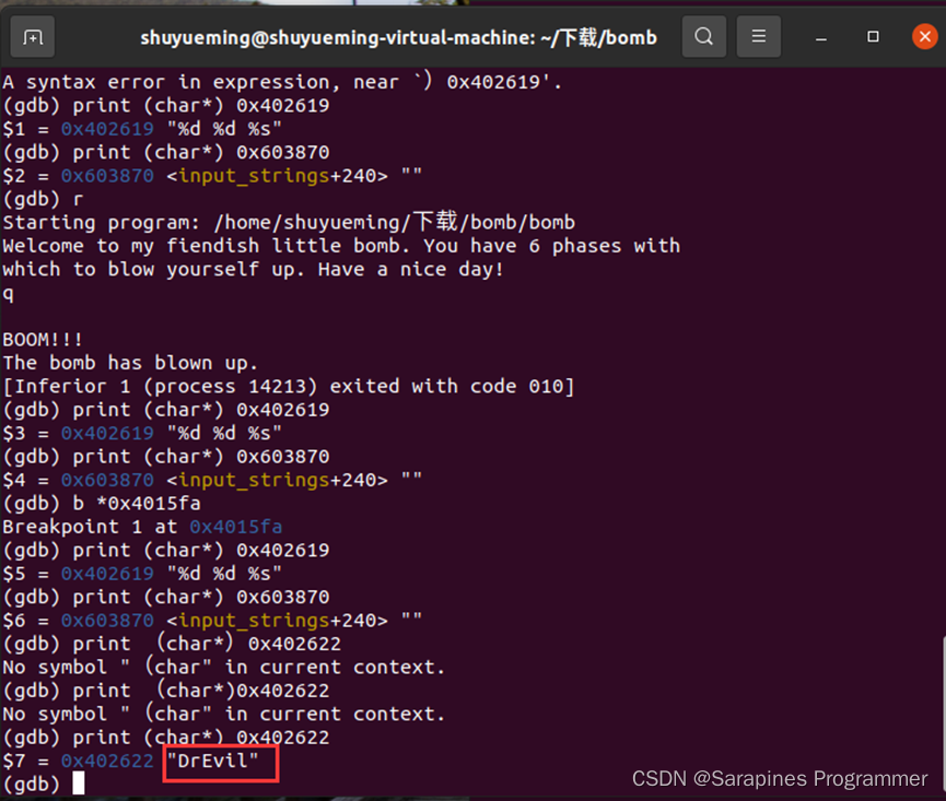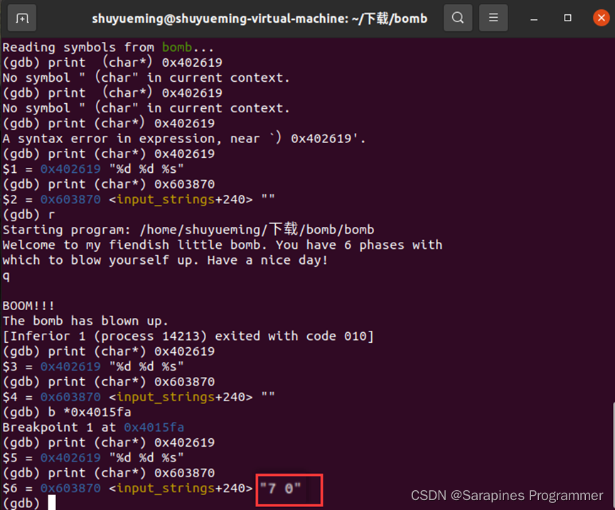 根据代码可以猜测,我们需要输入两个数字。为了查看这几个参数对应的字符串,我们可以使用GDB调试器。我们可以先输入之前完成的字符串,并在0x4015fa处设置断点,最后查看断点处的参数。在gdb试探性输入print (char*)0x402619和print (char*)0x603870。