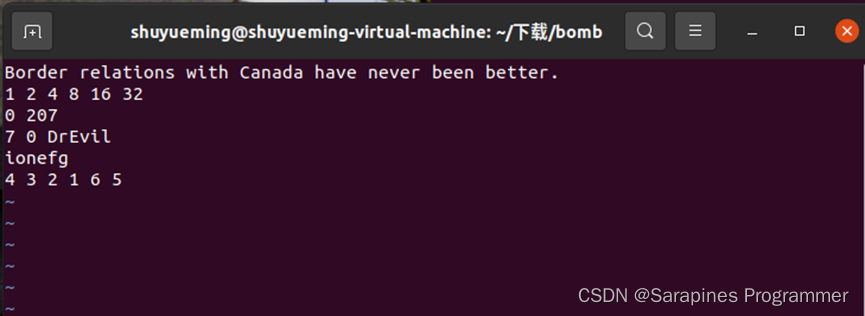 “Binary bombs”是一个可在Linux系统上运行的C程序,它由6个不同的阶段(phase1~phase6)组成。在每个阶段,程序会要求输入一个特定的字符串。如果输入的字符串符合程序的预期输入,那么这个阶段的炸弹就会被“解除”,否则炸弹就会“爆炸”,并输出“BOOM!!!”的提示信息。实验的目的是尽可能多地解除这些炸弹的阶段。
