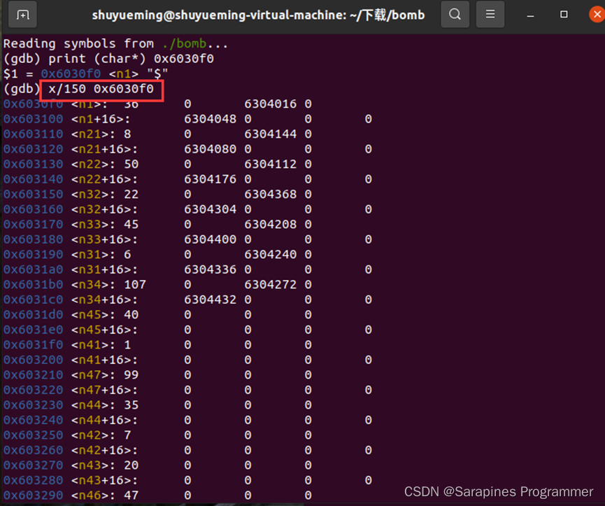 首先,查看0x6030f0中存放的数据,发现它类似于phase 6中的结构体。在6304xxx地址处应该是一个指针。同时,我们意外地发现,phase 6的指针数组就在下方。这里实际上是一个带有两个指针的结构体。前面的7个结构体的两个指针都是有值的,它们指向其他的结构体。而最后8个结构体的指针是没有值的,只有头部数据。这些指针所指的数据结构是一个二叉树。