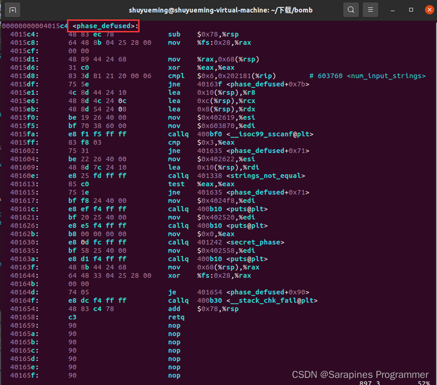 需要找到 secret_phase 函数的入口,也就是调用了 secret_phase 的函数。在 bomb.asm 文件中搜索,发现 phase_defused 函数调用了 secret_phase 函数。而在 bomb.c 文件中,每个 phase 后面都有一个 phase_defused 函数调用。因此可以通过分析 phase_defused 函数来找到调用 secret_phase 函数的位置。