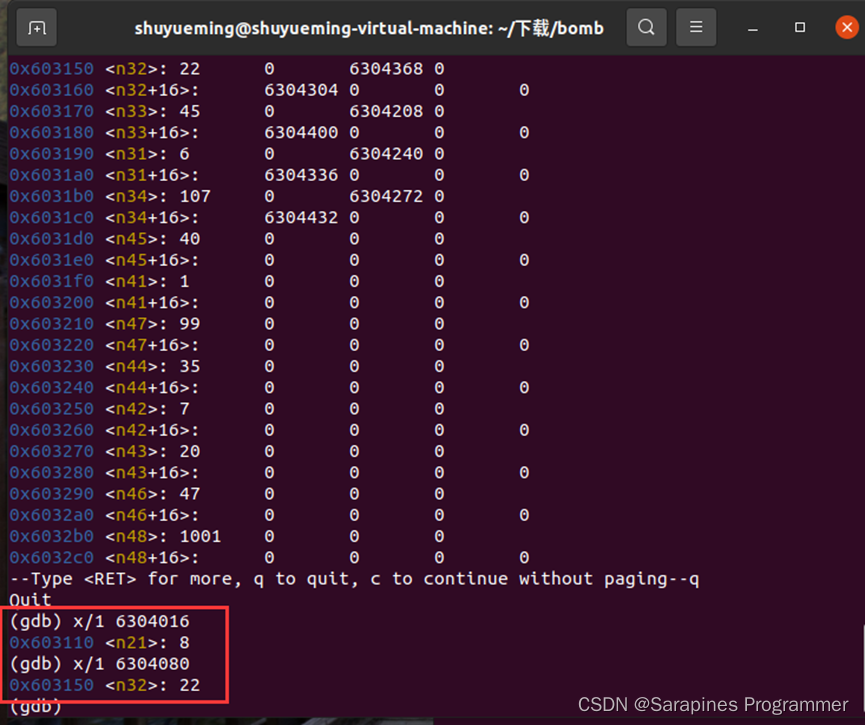 1.首先,我们来到二叉树的首地址0x6030f0,对应的数据为36。因为36需要大于x,才能使得%eax = %eax*2成立。因此,指针值应该是%rdi + 8,即加载左结点。指针值为6304016,查看得到值为8。