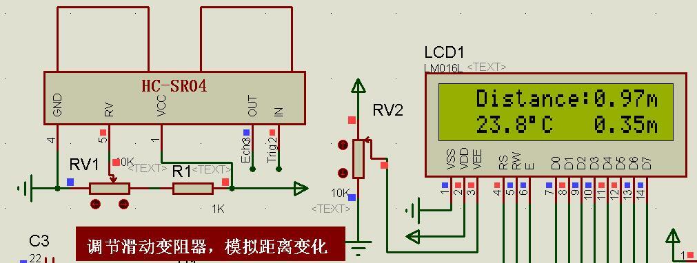 点击DS18B20温度传感器模块的上、下红色箭头,模拟温度值的变化;调节HC-SR04超声波模块下的滑动变阻器RV1(左右两个箭头),模拟倒车过程中距离的改变。设计咨询,作者QQ:2327603104.