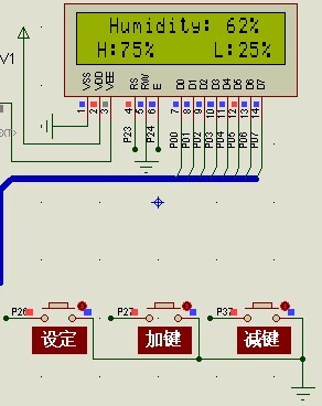 此时,湿度低报警灯和蜂鸣器处于关闭状态,继电器RL1开关打至下方,水泵处于断电状态。