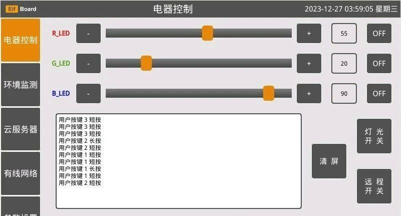 界面1是一个电器控制界面,通过这个界面,可以对端侧的电器设备进行无线控制,比如RGB三色灯的开关和亮度调节,灯光总开关的控制,远程继电器开关的控制,等等。当端侧无线设备有按键事件触发的时候,可以即时把按键值通过无线方式上报到边缘中控设备,并把按键事件在信息窗口进行显示。