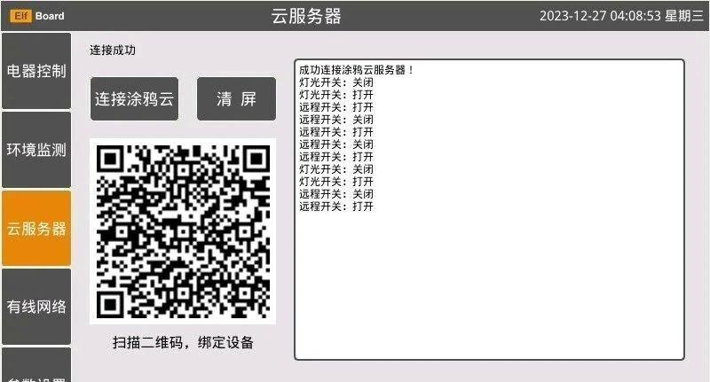 界面3是一个云服务器连接界面,通过【连接涂鸦云】按钮,把边缘中控ELF 1S开发板接入涂鸦云服务器,然后通过手机端【智能生活APP】扫描二维码,即可完成手机APP与设备的绑定操作,并且在信息窗口显示连接状态,手机APP通过云端转发的控制指令,也可以实时在信息窗口进行显示。