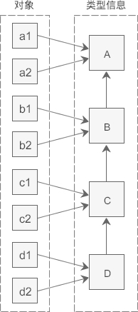 在《C++ RTTI机制下的对象内存模型(透彻)》一节中,我们讲到了有虚函数存在时对象的真实内存模型,并且也了解到,每个类都会在内存中保存一份类型信息,编译器会将存在继承关系的类的类型信息使用指针“连接”起来,从而形成一个继承链(Inheritance Chain),也就是如下图所示的样子:
