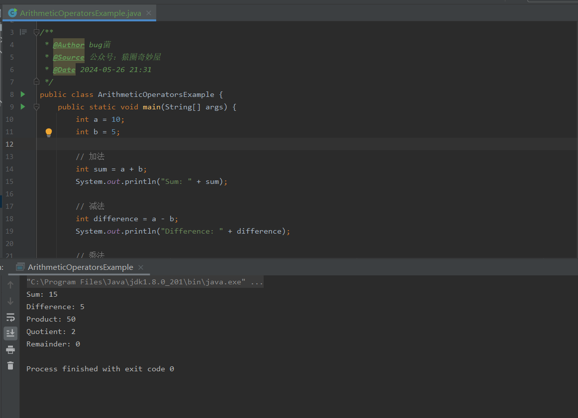 这个程序我展示了如何使用Java中的算术运算符。以下是程序的主要部分: