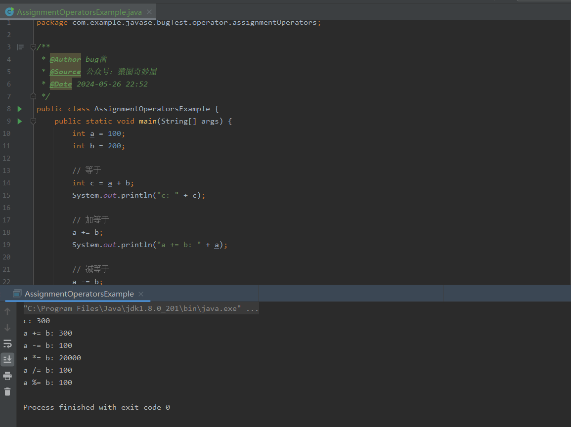 该代码演示了Java中的赋值运算符(Assignment Operators)的使用。首先,定义了两个整数变量a和b,并初始化为100和200。然后,使用赋值运算符"+",将a和b的值相加,并将结果赋给变量c。打印出"c: 300"。接着,使用赋值运算符"+=",将a的值和b的值相加,并将结果再次赋给a。打印出"a += b: 300"。接下来,使用赋值运算符"-=",将a的值减去b的值,并将结果再次赋给a。打印出"a -= b: -100"。然后,使用赋值运算符"*=",将a的值乘以b的值,并将结果再次赋给a。打印出"a *= b: -20000"。再接着,使用赋值运算符"/=",将a的值除以b的值,并将结果再次赋给a。打印出"a /= b: -100"。最后,使用赋值运算符"%=",将a的值取模b的值,并将结果再次赋给a。打印出"a %= b: -100"。赋值运算符可以将一个表达式的值赋给一个变量,并同时对变量进行操作,是常见的编程操作之一。