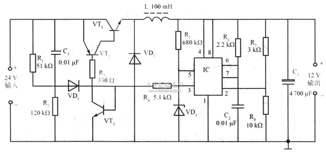 3)调节:输出电压的稳定是通过反馈环路来实现的。当输出电压升高时,通过取样电阻取得的样本信号就会升高,这个信号与基准电压比较后得出的误差信号就会增大,然后通过PWM或PFM控制的方式减小开关管的导通时间,从而降低变换器输出的平均功率,实现输出电压的稳定。