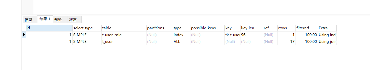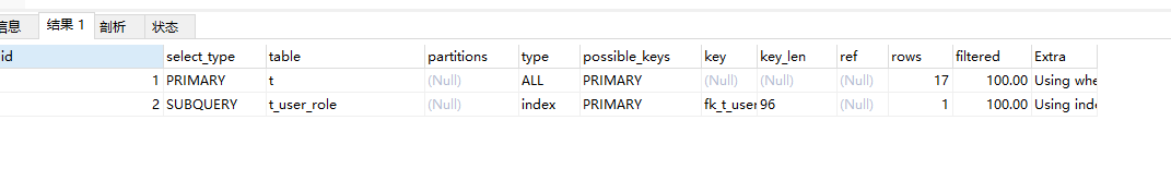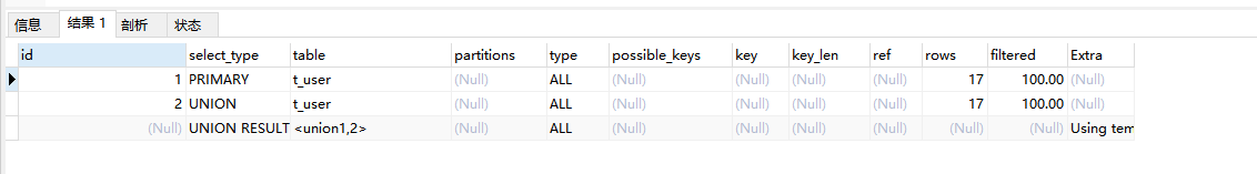 对于包含union子句的查询语句来说,每个SELECT关键字对应一个id值也是没错的,但还是有点特别的东西。EXPLAIN SELECT * FROMt_userUNION select * from t_user
