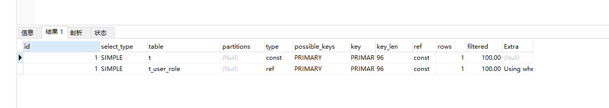 - eq_ref:执行连接查询时,如果被驱动表是通过主键或者不允许存储NULL值的唯一二级索引列等值匹配的方式进行访问的(如果该主键或者不允许存储NULL值的唯一二级索引是联合索引,则所有索引列都必须进行等值比较),则对该驱动表的访问方法就是eq_ref.