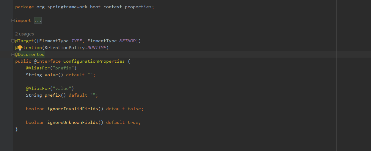 @Retention(RetentionPolicy.RUNTIME): 这个元注解定义了@ConfigurationProperties注解的保留策略。RetentionPolicy.RUNTIME表示注解在 JVM 运行时依然有效,可以通过反射读取注解信息。