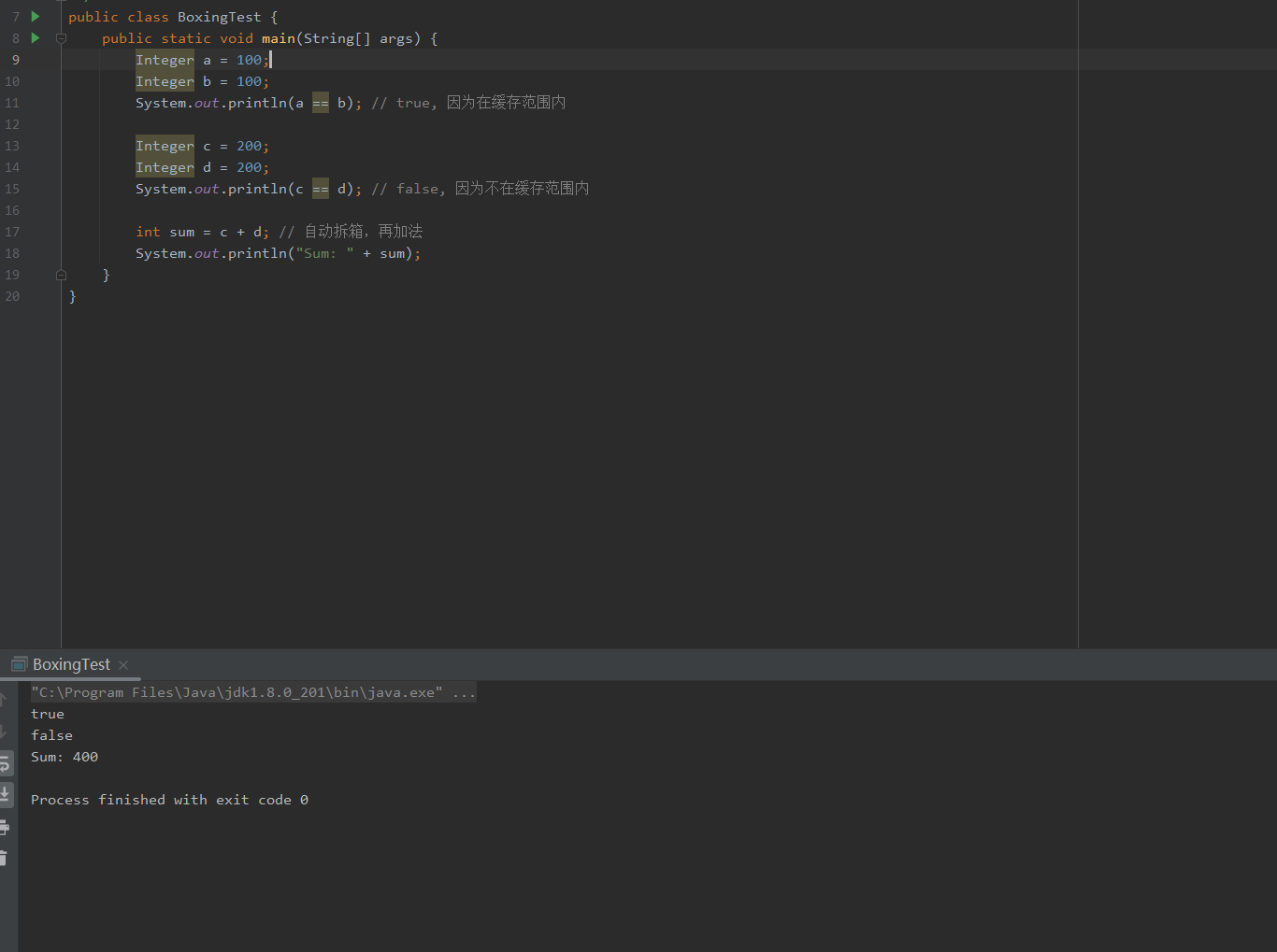 sum = c + d;中,c和d被自动拆箱为int,然后进行加法运算,最终结果为400。