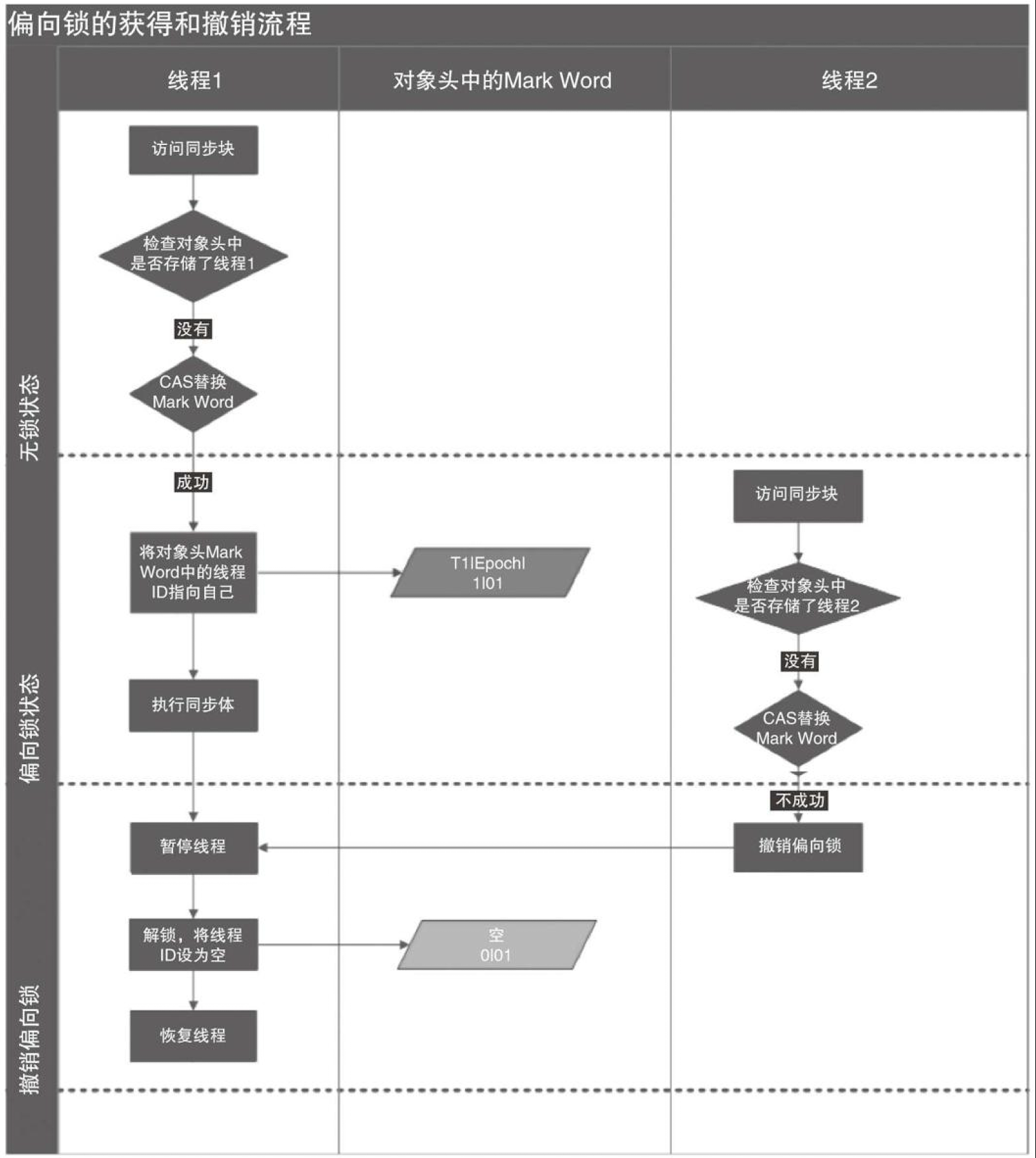 为了在只有一个线程执行同步块时提高性能,当一个线程访问同步块并获取锁时,会在对象头和栈帧中的锁记录里存储锁偏向的线程 ID,以后该线程在进入和退出同步块时不需要进行 CAS 操作来加锁和解锁,只需简单地测试一下对象头的 Mark Word 里是否存储着指向当前线程的偏向锁。如果测试成功,表示线程已经获得了锁。如果测试失败,则需要再测试一下 Mark Word 中偏向锁的标识是否设置成 1 (表示当前是偏向锁):