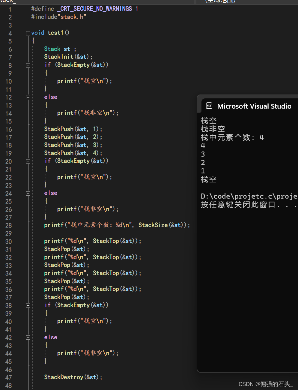 - 返回top==0的结果(因为这里top指向的是栈顶元素的下一个元素,所以栈空时top==0)