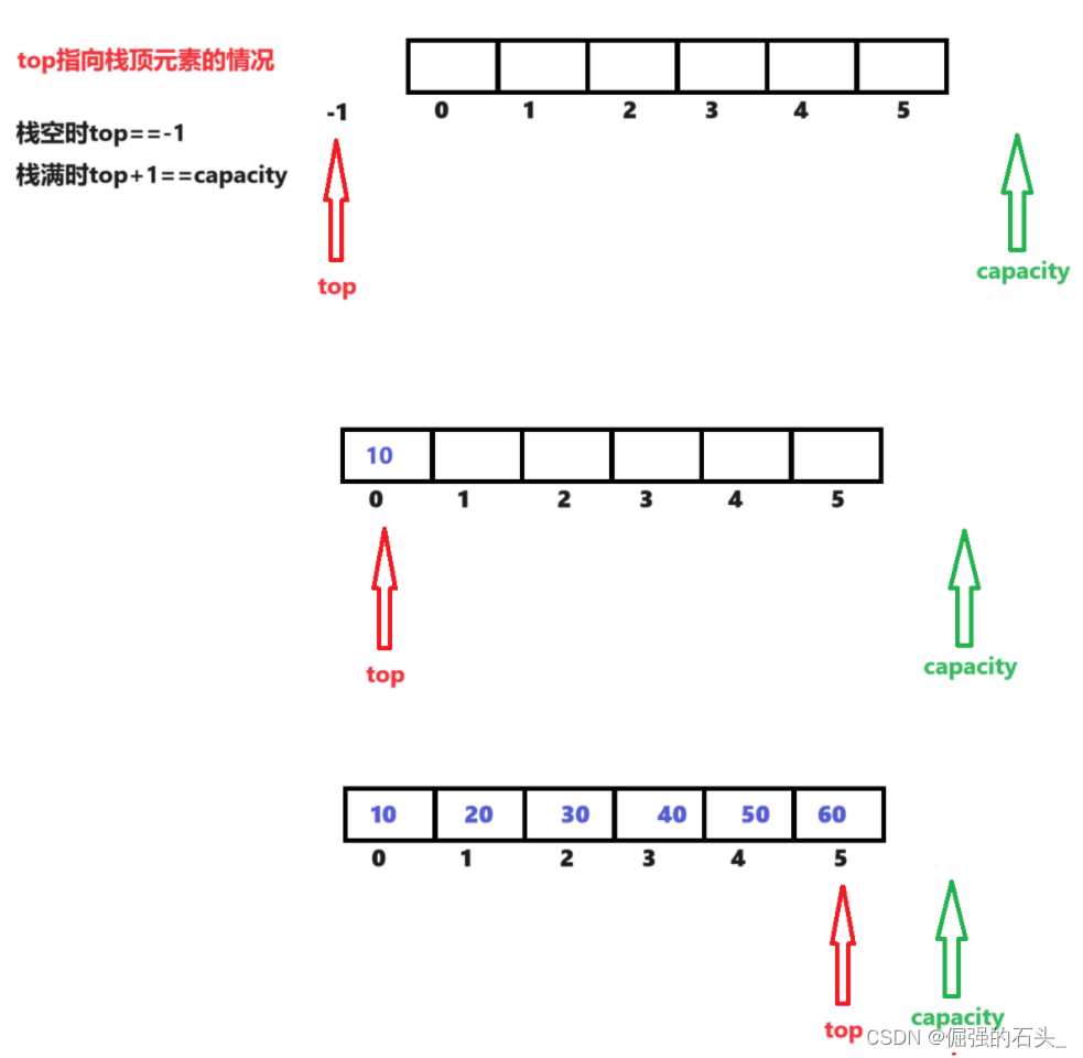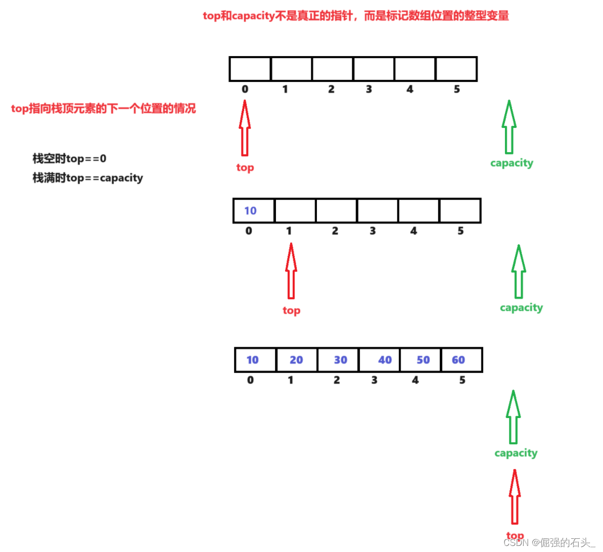 - top和capacity初始化为0(这里top指向的是栈顶元素的下一个位置)