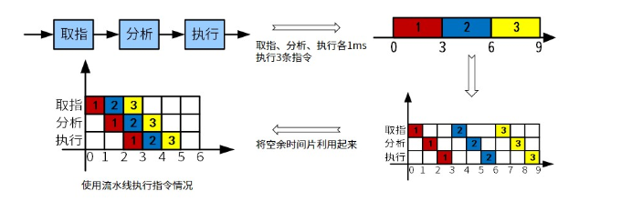指令流水线原理:将指令分成不同段,每段由不同的部分去处理,因此可以产生叠加的效果,所有的部件去处理指令的不同段。