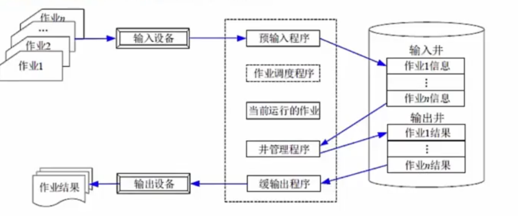 引入SPOOLING(外围设备联机操作)技术,就是在外设上建立两个数据缓冲区,分别称为输入井和输出井,这样,无论多少进程,都可以共用这一台打印机,只需要将打印命令发出,数据就会排队存储在缓冲区中,打印机会自动按顺序打印,实现了物理外设的共享,使得每个进程都感觉在使用一个打印机这就是物理设备的虚拟化。如下图所示: