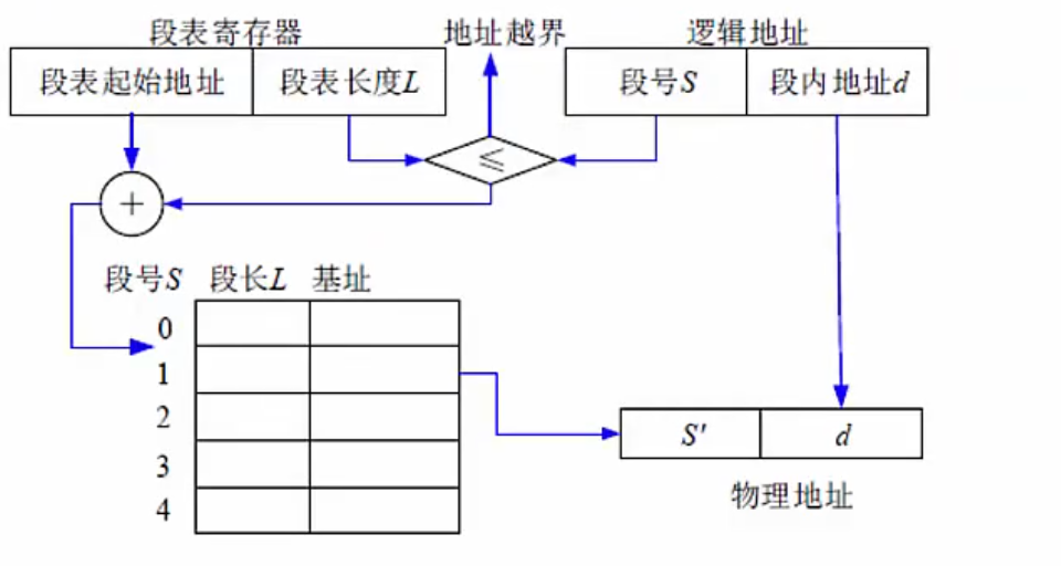 将进程空间分为一个个段,每段也有段号和段内地址,与页式存储不同的是每段物理大小不同,分段是根据逻辑整体分段的,因此,段表也与页表的内容不同,页表中直接是逻辑页号对应物理块号,而下图所示,段表有段长和基址两个属性,才能确定一个逻辑段在物理段中的位置。