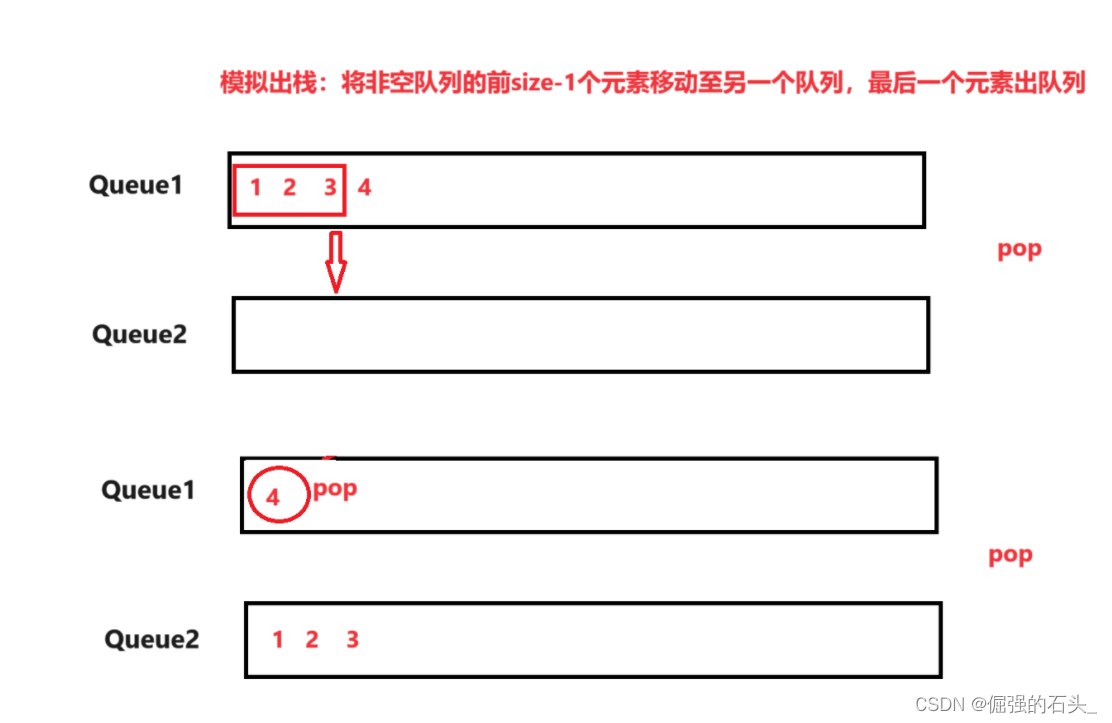 - 将非空队列中的元素(除了最后一个)逐个出队并入队到另一个队列中,直到只剩下最后一个元素。此时,该元素就是栈顶元素,我们将其出队并返回。