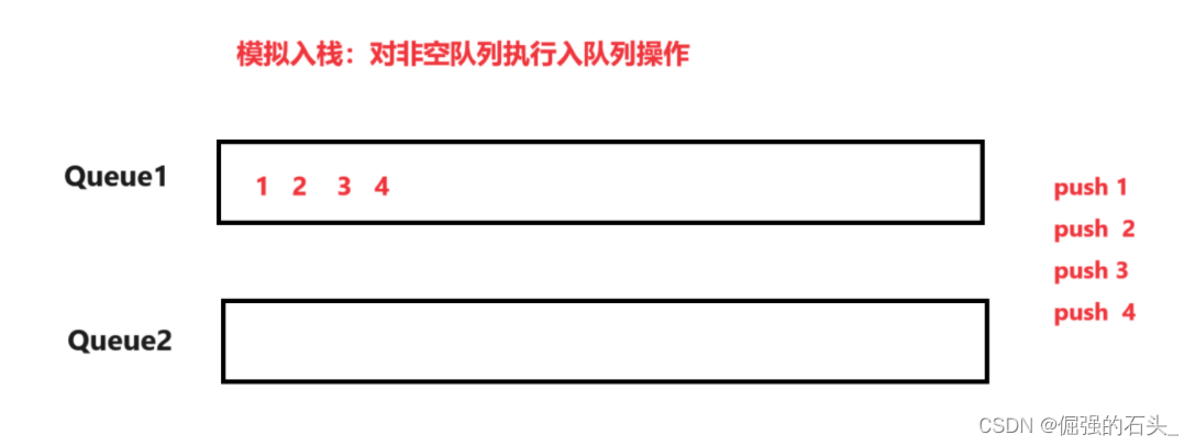 - 初始化:初始化两个空队列,在任意时刻,我们只会使用其中一个队列来进行入栈和出栈操作,而另一个队列则保持为空。