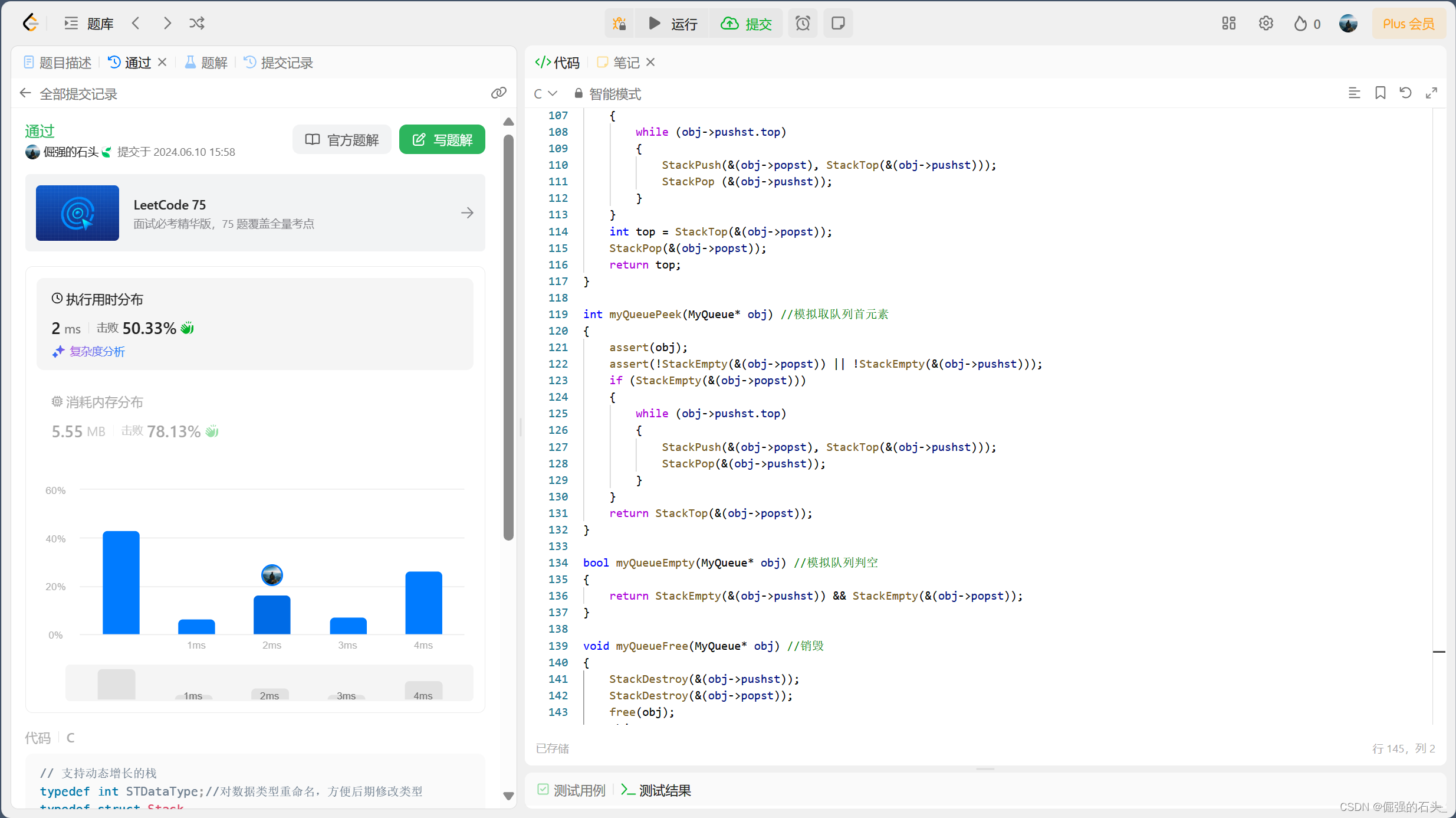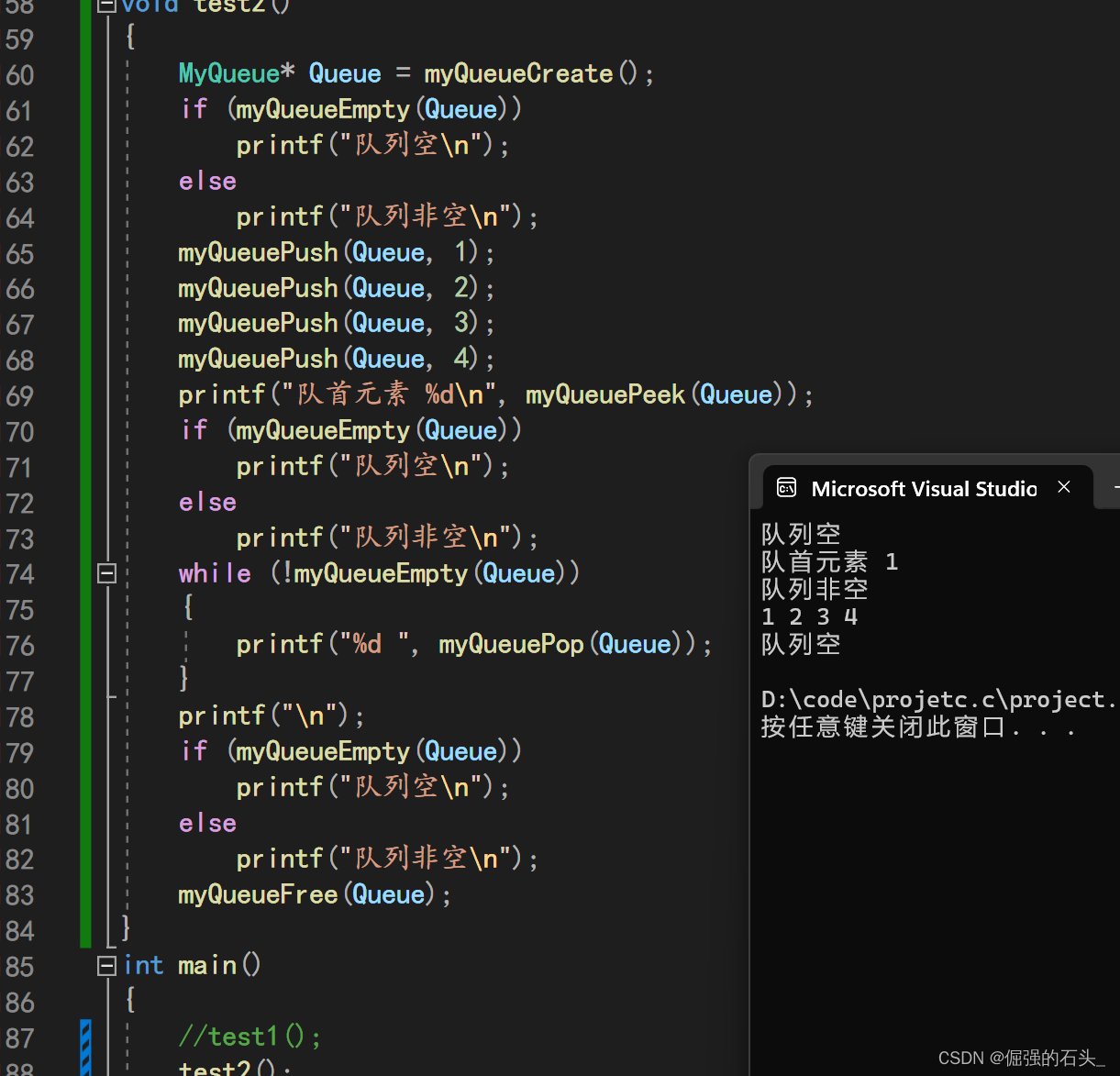 stack2为空,则将stack1中的所有元素逐个弹出并压入stack2(这个操作实际上是将stack1的元素反转后压入stack2),然后再从stack2弹出栈顶元素,作为出队元素。- 取队首元素:类似出队操作,只是最后支取栈顶元素,不出栈