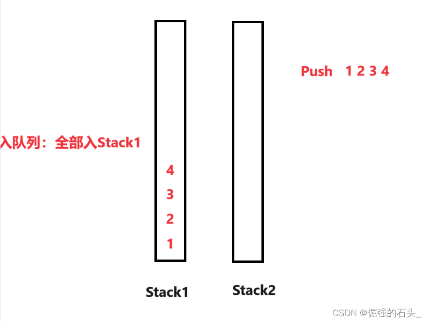 stack1和stack2。其中一个栈(例如stack1)用于入队操作,另一个栈(例如stack2)用于出队操作。- 入队操作:所有元素都压入