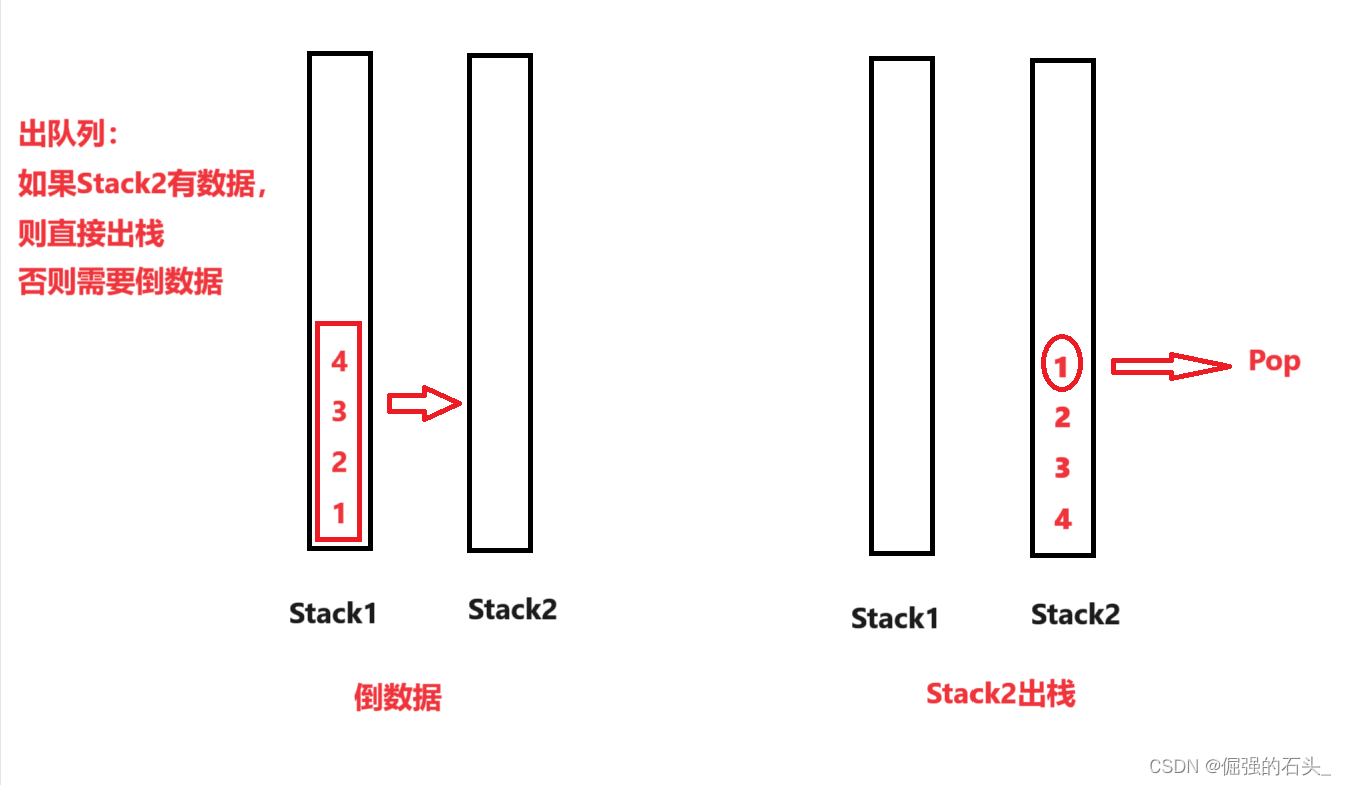 stack2不为空,直接从stack2弹出栈顶元素,作为出队元素。- 如果