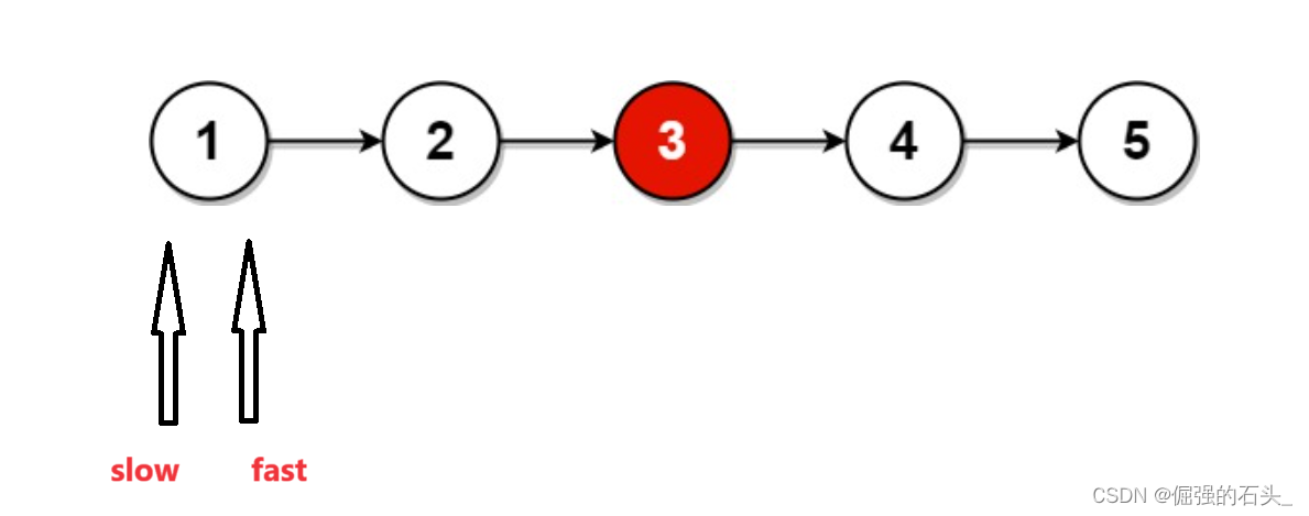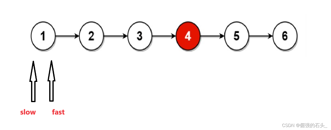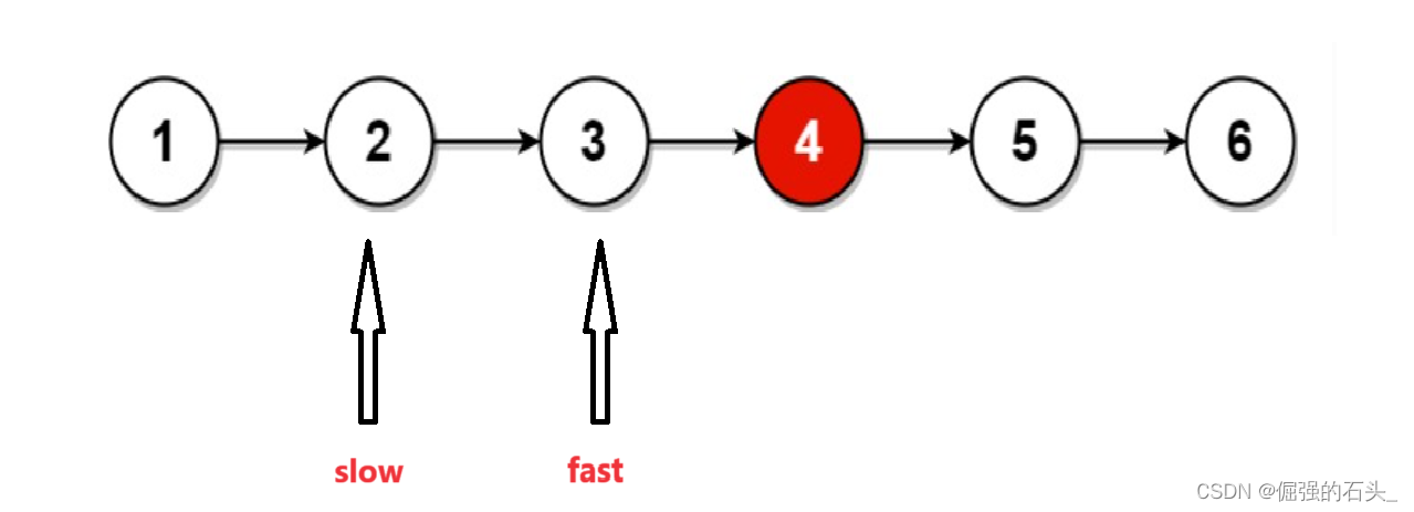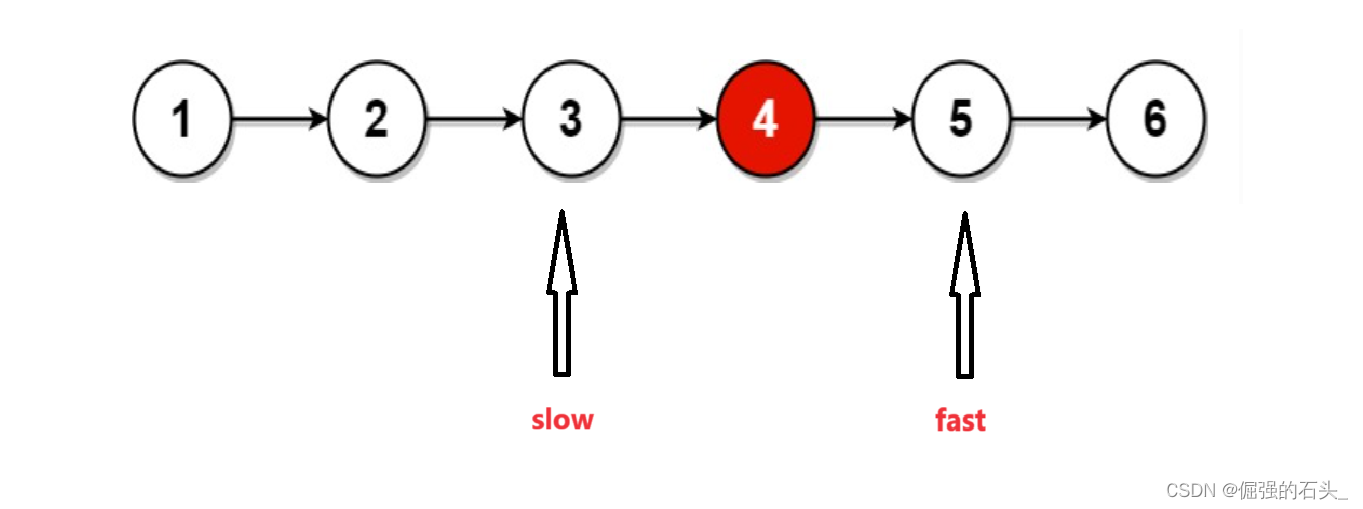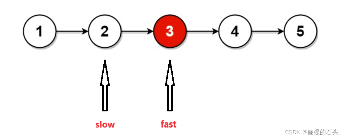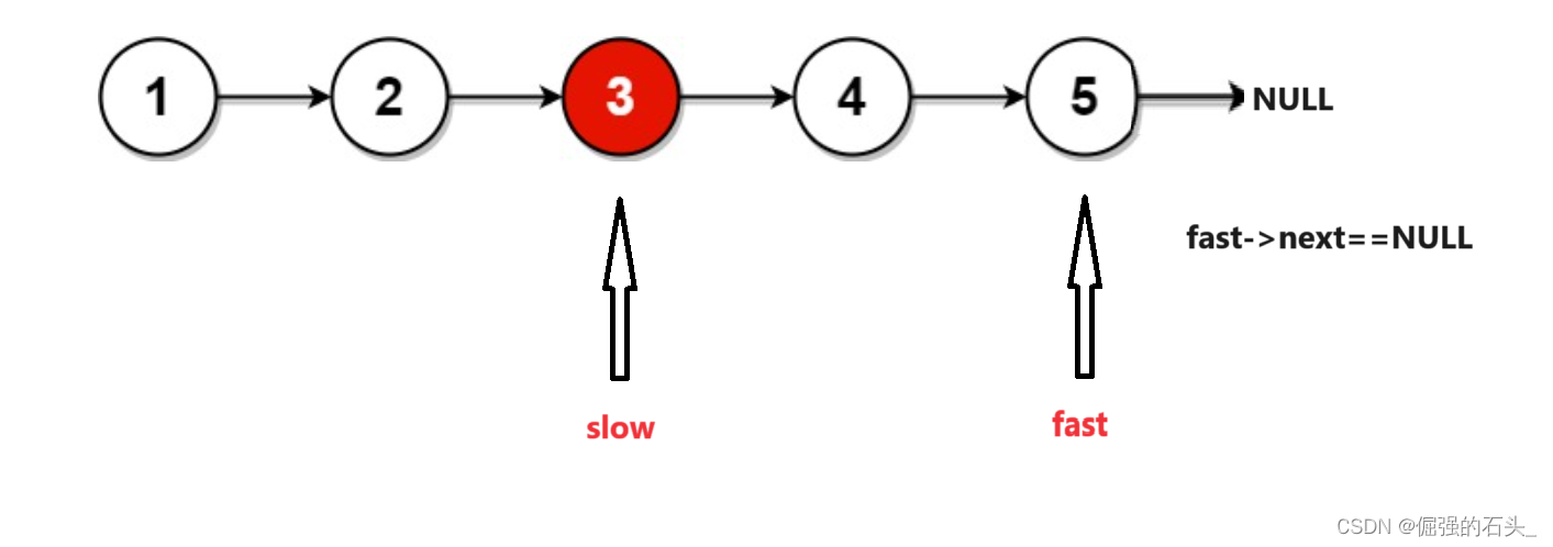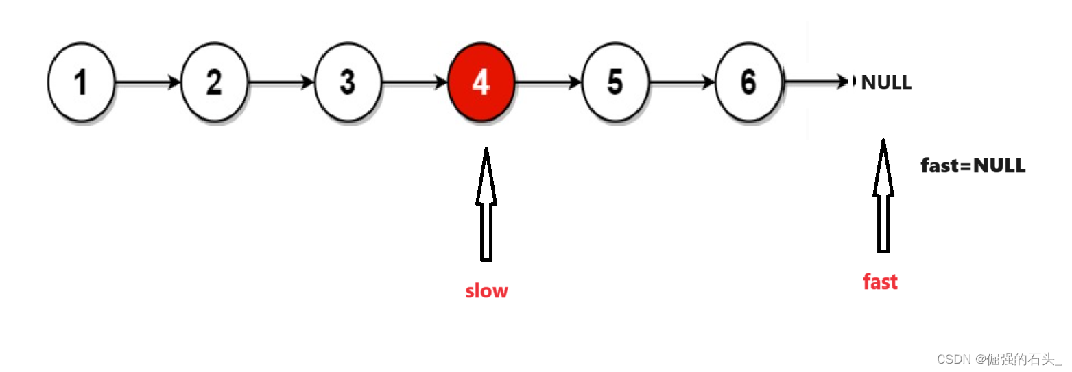 4.当fast为NULL时,不能继续移动,此时slow指针指向的就是中间节点