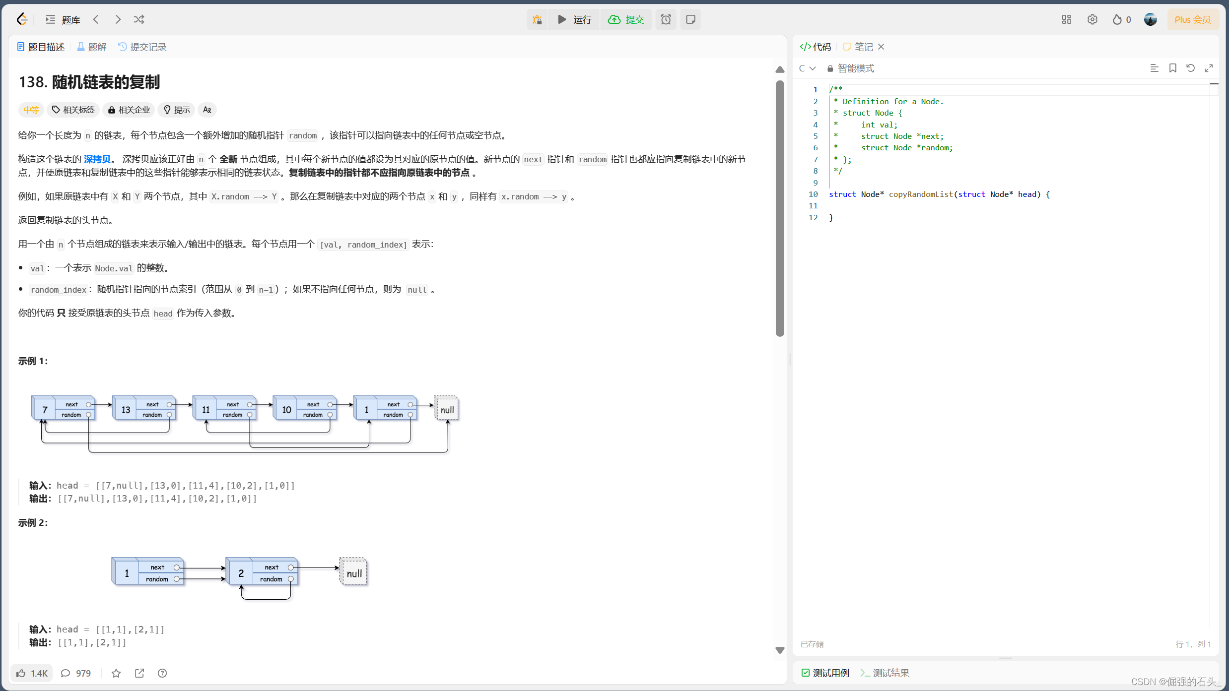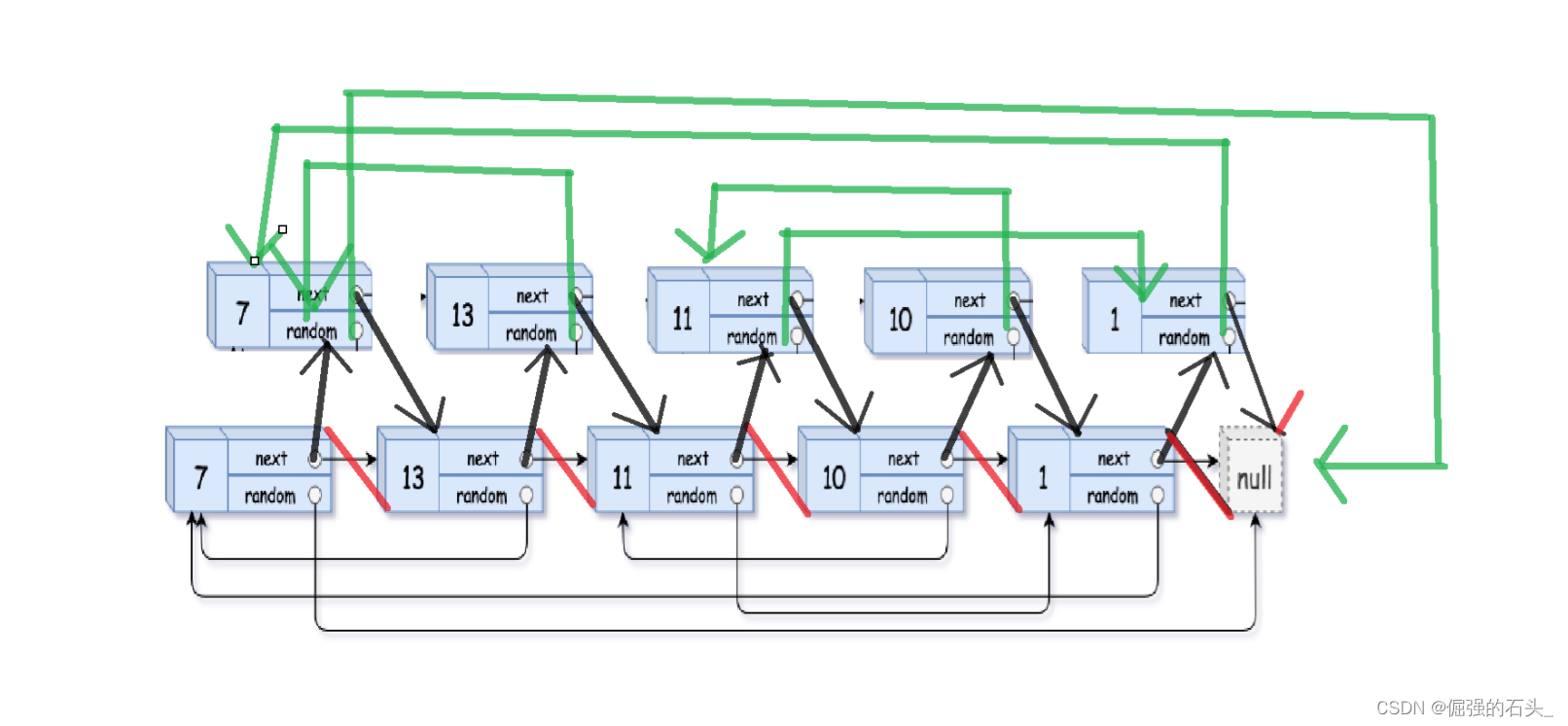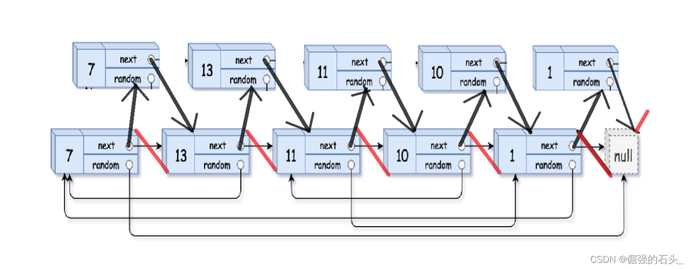 - 完成节点的随机指针拷贝——原节点的随机指针指向哪里,拷贝节点就指向对应节点的下一个节点(这一部分是这条思路能实现的关键)