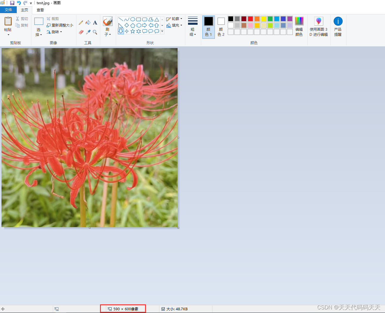 在Windows系统的画图工具中 打开测试图片,得到如下界面,在这个界面中,我们可以看到在水平方向上的像素个数是590,在垂直方向上的像素个数是600。