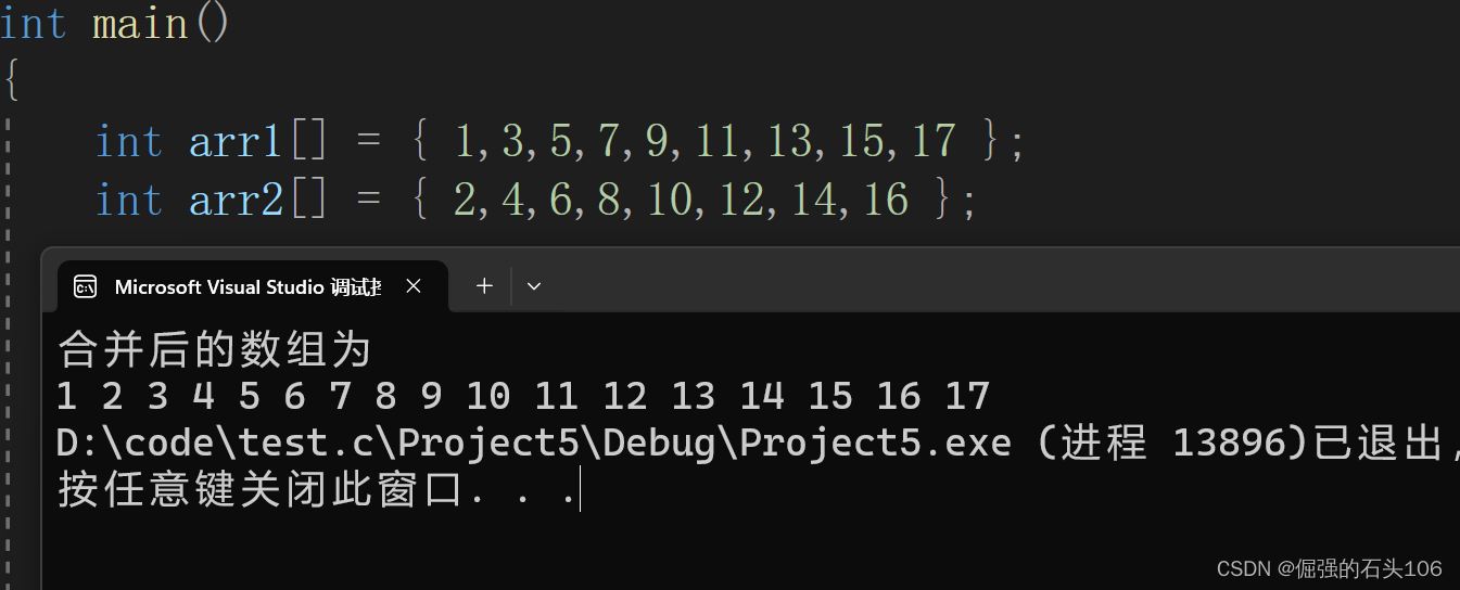 ——我这里因为使用的编译器是VS2022,不支持变长数组,所以直接申请了100大小的数组来存放合并后的序列。如果在其他编译器上可以直接申请一个m+n大小的数组