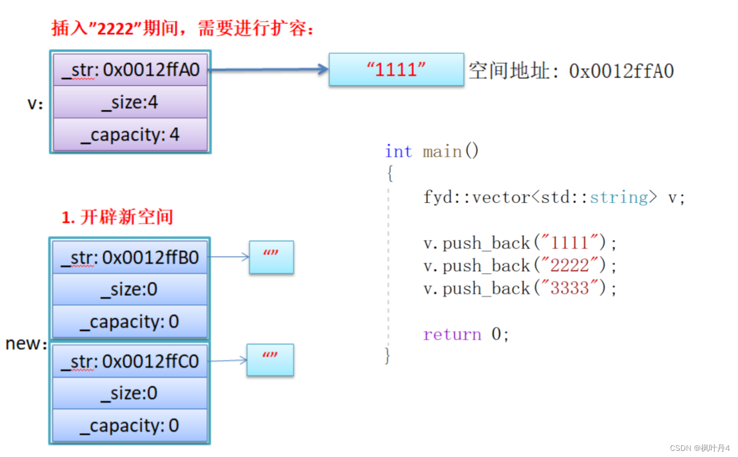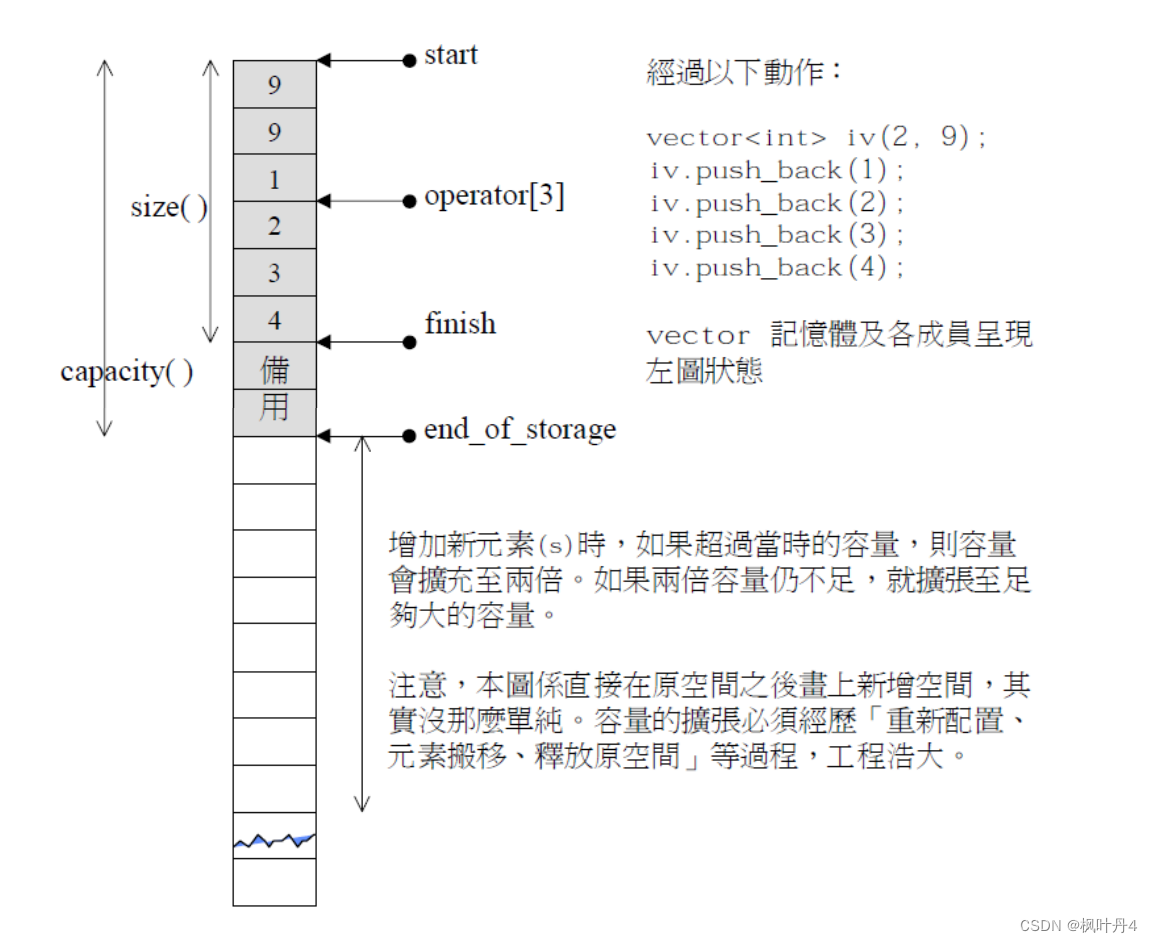 - 本质讲,vector使用动态分配数组来存储它的元素。当新元素插入时,这个数组需要被重新分配大小为了增加存储空间。其做法是,分配一个新的数组,然后将全部元素移到这个数组。就时间而言,这是一个相对代价高的任务,因为每当一个新的元素加入到容器时,vector并不会每次都重新分配大小;