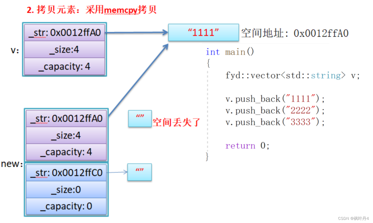 - 如果拷贝的是自定义类型的元素,memcpy既高效又不会出错,但如果拷贝的是自定义类型元素,并且自定义类型元素中涉及到资源管理时,就会出错,因为memcpy的拷贝实际是浅拷贝。