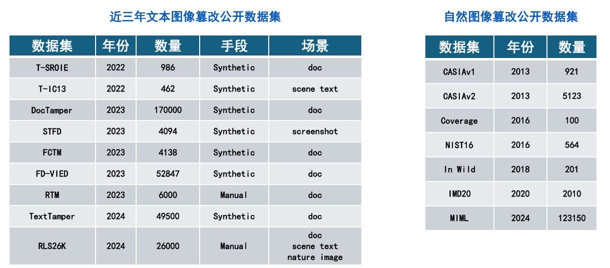 随着视觉内容安全领域的不断深入,公开数据集和性能评估标准日益完善。特别是图像篡改的公开数据集呈爆发式增长,为研究者提供了丰富的测试数据,推动了模型性能的不断提升。评测方法的完善使得不同算法的效果可以进行公正、客观的比较。